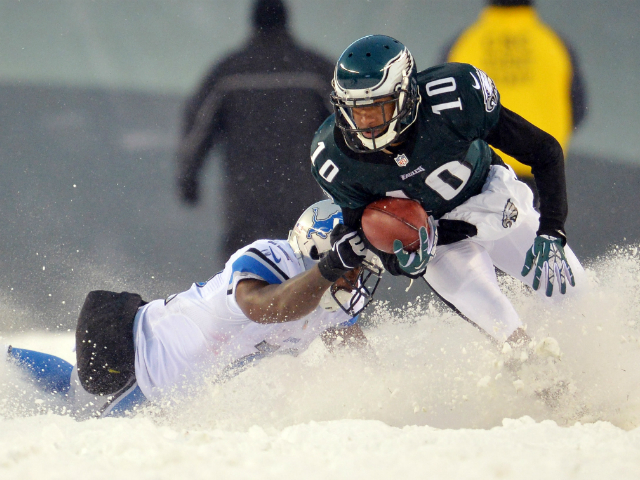 Philadelphia Eagles wide receiver DeSean Jackson (10) returns a punt against the Detroit Lions during the fourth quarter amidst heavy snow. Jeffrey G. Pittenger-USA TODAY Sports / Reuters