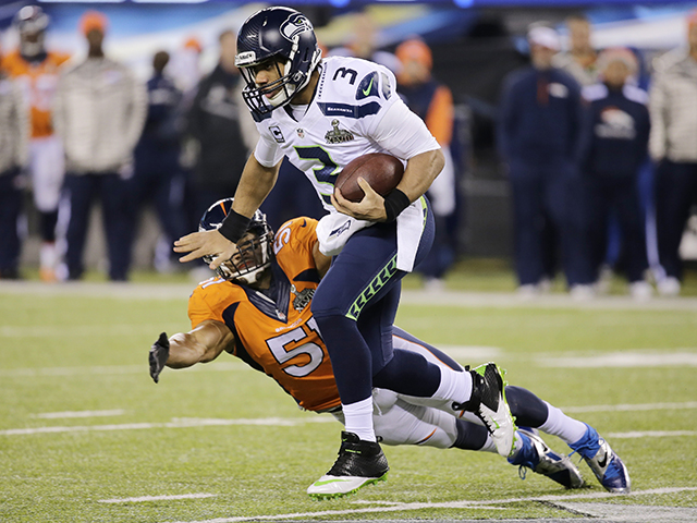 Seattle Seahawks quarterback Russell Wilson breaks a tackle by Denver Broncos middle linebacker Paris Lenon . Ray Stubblebine / Reuters