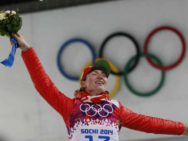 Belarus' Darya Domracheva celebrates during the flower ceremony for the women's biathlon 15km individual event. Stefan Wermuth / Reuters