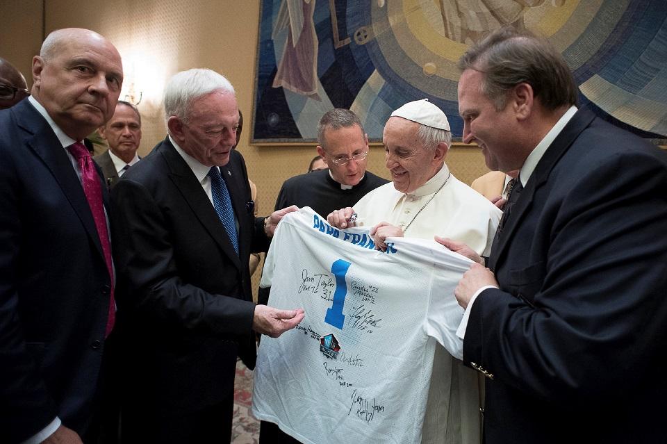 Those who met the pope included Dallas Cowboys owner Jerry Jones, who is due to be inducted into the Hall of Fame in August, and six previous Hall of Fame inductees including Ronnie Lott, Franco Harris and Curtis Martin.