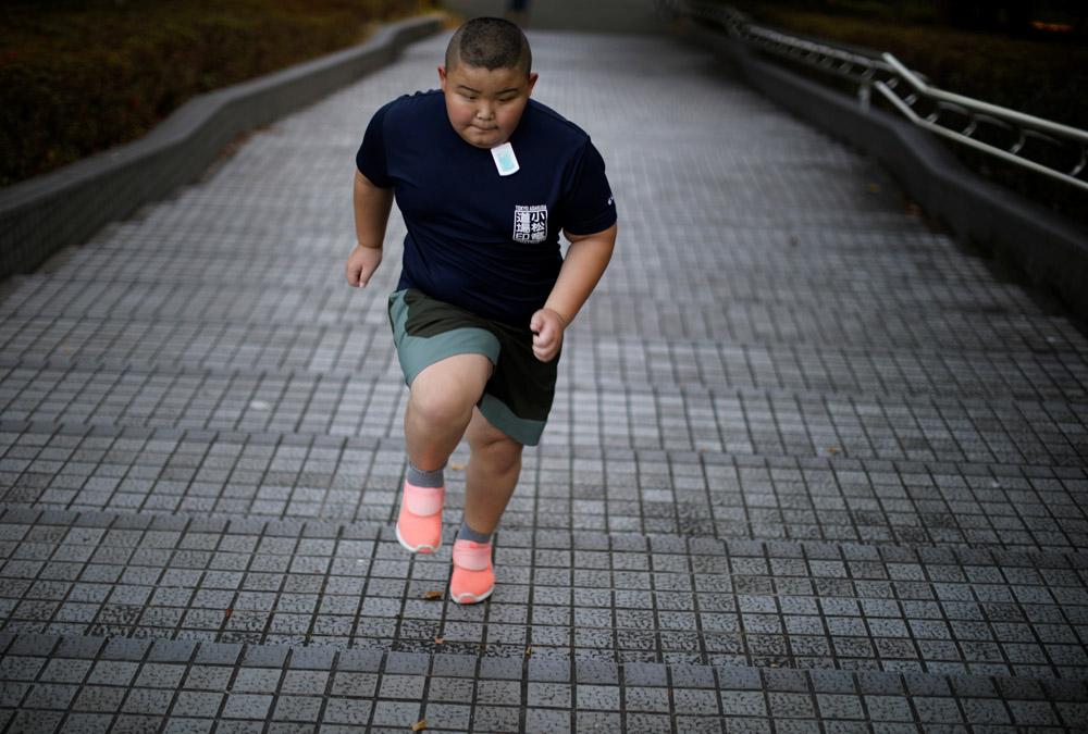 Among the young sumo wrestlers lifting weights in the ring, 10-year-old Kyuta Kumagai stands out.
