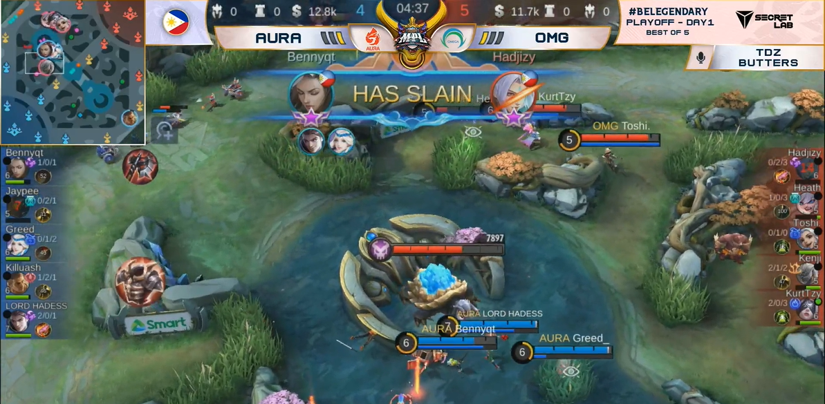 But Aura held on and a crucial skirmish in the 17th minute led to takedowns of Salic "Hadjizy" Iman (Granger) and Jankurt "KurtTzy" Matria (Kagura) that helped Aura spread the map and allowed Jaymark "Lord Hadess" Lazaro (Ling) to secure the buffs for himself.