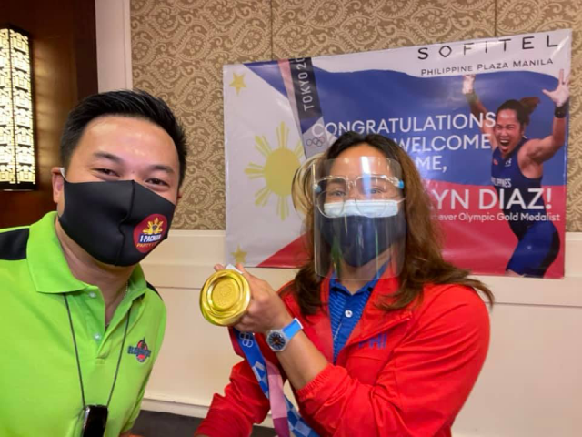 Fresh from her mandatory quarantine after a gold medal finish in the Tokyo Olympics, Hidilyn Diaz personally received the incentives made by representative Mikee Romero.