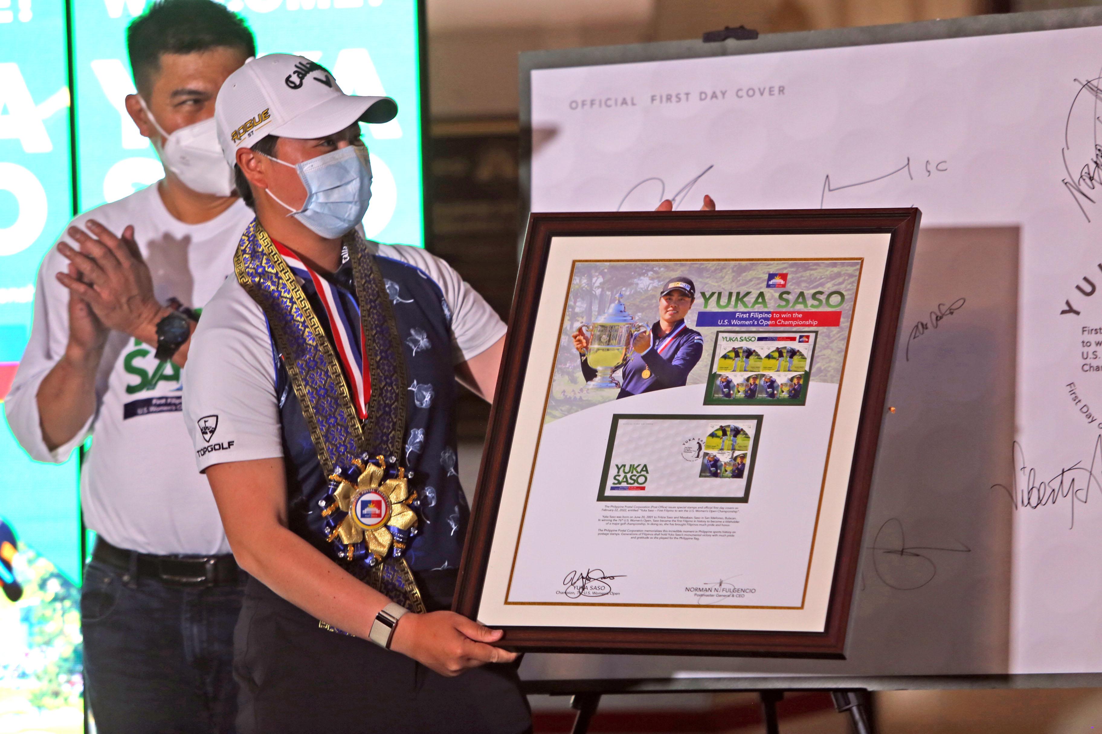 Filipino-Japanese golfer Yuka Saso unveiled the newly-released stamps featuring her winning moment at the 2021 US Women's Open.