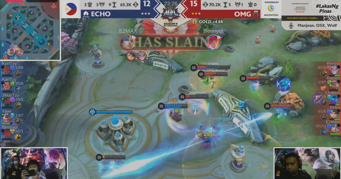 He opened the fightback by scoring three kills in the 7th minute, including a massive outplay on Frediemar "3MarTzy" Serafico (Paquito) in a midlane skirmish, then scored a pick off on KarlTzy in the 16th minute to take the luminous lord.