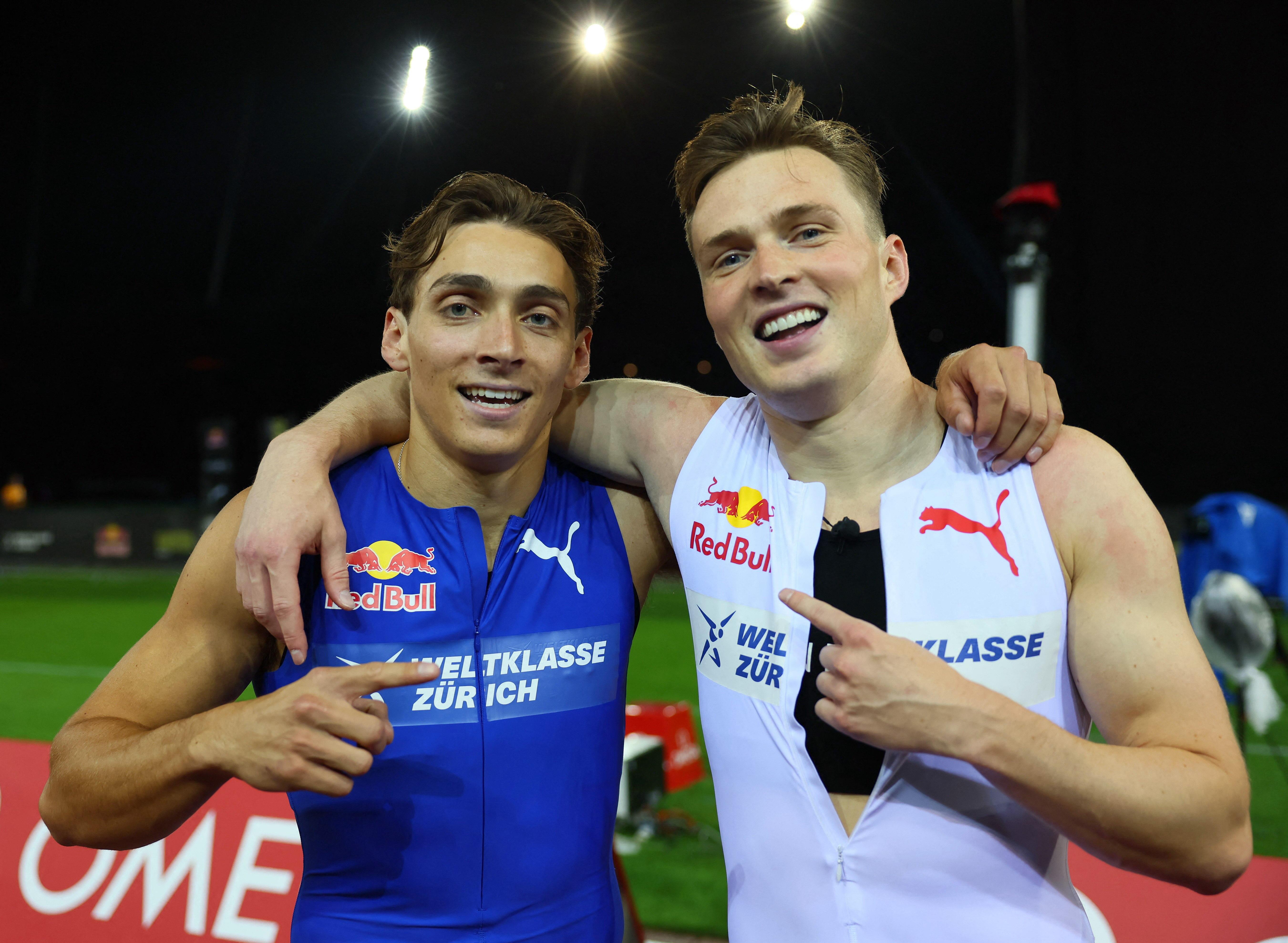 The pair entered the track like boxers coming into the ring, with Duplantis in the blue satin gown and Warholm in the red, and there had been plenty of fighting talk in the build-up and light-hearted trash-talk between the friends.