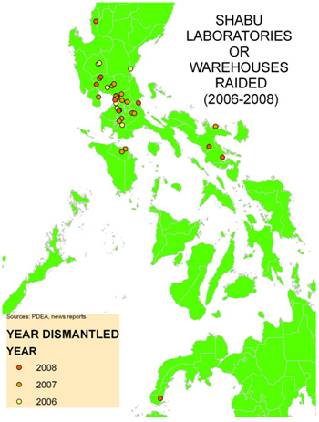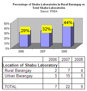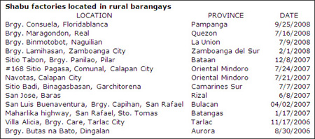 Using Geographic Information System, News Research mapped the 38 shabu laboratories/warehouses found in 2006 (7 shabu labs), 2007 (22) and 2008 (9). The GIS shows an increasing number of shabu factories in rural barangays. In 2006, 29 percent of the raided laboratories were in rural areas. This increased to 32 percent in 2007 and 44 percent in 2008. A rural barangay has a population of less than 5,000 and lacks a sizeable business establishment. Shabu laboratories were discovered in Bulacan and Laguna in 2006. In 2007, shabu factories were found in Oriental Mindoro and Camarines Sur. In 2008, the factories were in La Union in the Ilocos Region, Legazpi City and Iriga City in Bicol and Zamboanga City. Based on police reports, some establishments were disguised as farms, resorts and fishponds. The emerging pattern indicates that illegal drug traffickers are now more willing to go to great lengths to hide their trade. Former senator and Drug Watch Philippines founder Ernesto Herrera said this is a natural course in the shabu-making business. âShabu laboratory operators need some form of seclusion for their own protection, because the smell alone could get the neighbors suspicious. Sa amoy pa lang, kapag sa residential area na yan, mataas ang risk na malaman kung anong activity ang ginagawa diyan," Herrera said. Police and PDEA reports show that raids on these clandestine shabu factories were prompted by neighborsâ complaints of nauseating odor. Herrera said urban areas are highly accessible, thus, any illegal activity can be detected. âIn urban areas, media is very active. Madaling puntahan agad kung sakaling mabalitang may suspicious activities na na-re-report," Herrera said. On the other hand, rural areas are harder to access so they provide a good camouflage, he added. The 2008 World Drug Report issued by the United Nations Office on Drugs and Crime (UNODC) says more and more shabu laboratories are located away from Metro Manila from 2006 to 2008. The report attributed this to heightened law enforcement. Drug lords opt to locate in southern Luzon, Bicol, even Mindanao, the report said. Shabu factories were also discovered during raids conducted in Cebu in 2004 and Davao City and Cagayan de Oro City in 2005. The presence of these shabu laboratories is proof of what has been feared for quite some time: that the Philippines is no longer just an importer of shabu. Experts say the strategic location of the country makes it a vital link in the production, distribution and consumption of illegal drugs in the region. The UNODC considers the Philippines as a major trafficking and manufacturing site of shabu. PDEA said shabu remains the drug of choice of majority (63 percent) of local drug users. Drug Watch says the some local police and government officials are party to the crime of illegal drugs manufacture. âDrug lords need protection. Bukod sa geographical, I guess they have some sort of protection from local officials â police or barangay officials," said Herrera. âI think they are part of the conspiracy. Imposibleng hindi nila alam. Lalo na kung laboratory yan, no way na hindi malaman ng mga barangay tanod dahil they are the ones checking the activities in their area. They are supposed to visit the place," he added. Barangay permits are required before a building is erected, or before some sort of factory is built. Early this month, Interior Secretary Ronaldo Puno announced a âone-strike policy" against police officers who fail to wipe out illegal drugs in their area, especially those who do not lead anti-drug operations and ignore adverse reports on the presence of illegal drug dens or laboratories or widespread drug use. Puno said local officials may be administratively charges if they fail to act on PDEA or police reports on the âillegal sale of narcotics, rampant delivery and use of such illegal drugs and the discovery of marijuana plantations, laboratories of shabu and other illegal substances in their respective communities." - GMA News Research
