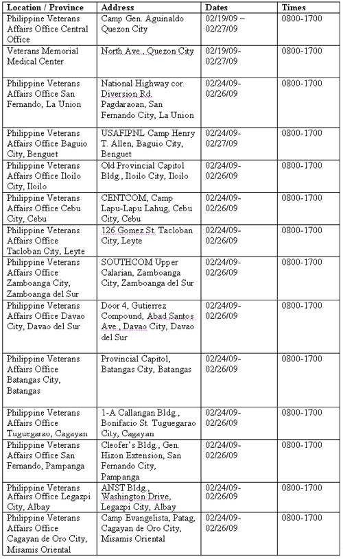 Below is a question-and-answer article released by the US Embassy on Thursday for those seeking information about the one-time lump sum benefits released by the US Department of Veterans Affairs for Filipino World War II veterans: Q: Who is eligible for the new benefit, a one-time payment authorized by the American Recovery and Reinvestment Act of 2009? ⢠Persons who served before July 1, 1946, in the organized military forces of the Government of the Commonwealth of the Philippines, while such forces were in the service of the Armed Forces of the United States; ⢠Members of the organized guerrilla forces under commanders appointed, designated, or subsequently recognized by the Commander in Chief, Southwest Pacific Area, or other competent authority in the Army of the United States; ⢠Persons who served in the Philippine Scouts under Section 14 of the Armed Forces Voluntary Recruitment Act of 1945. ⢠To be eligible for the new benefit, service members in each of the three categories above must have been discharged or released from service under conditions other than dishonorable. Q: How do I apply for this benefit? ⢠The United Stated Department of Veterans Affairs is now accepting claims. ⢠Veterans do not need to appear in-person. There is no fee to apply for this new benefit. Application forms are available at the US Embassy, the Veterans Memorial Medical Center in Quezon City and the 13 Philippine Veterans Affairs Offices located throughout the Philippines. ⢠Applications are now being accepted and will continue to be accepted for one year, until February 16, 2010. Those applications being mailed from within the Philippines may be mailed with required supporting documents, and should be sent to: US Department of Veterans Affairs 1131 Roxas Blvd. 0930 Manila, Philippines ⢠Veterans needing assistance with their application may request an appointment with the US Department of Veterans Affairs Manila Regional Office by calling (2) 528-2500 within Metro Manila or 1 800 1888 5252 toll free, or via e-mail at https://iris.va.gov. In many cases, any assistance you may need to complete the application can be provided by calling these numbers and you will not need to appear in person. ⢠Claims from spouses, widows and children of Filipino WWII veterans cannot be accepted. Q: What information or evidence do I need to submit with my application? ⢠Filipino WW II veterans wishing to submit a claim for this benefit should be prepared to present the following items to the United States Department of Veterans Affairs (if applicable): 1. Two forms of identification such as a driverâs license, birth certificate, Senior Citizen ID, Bureau of Post ID, Voter ID Card; 2. Copies of any military discharge documents showing service in one of the three qualifying types of service [See first answer for the three types of services]; 3. Your Philippines Veterans Affairs Office claim number; 4. Your Philippines Veterans Affairs Pension bank account number; 5. US citizens should bring your US passport. Q: Where do I apply for this benefit? ⢠Filipino WW II veterans can inquire about or submit a claim at the US Department of Veterans Affairs Manila Regional Office located at the US Embassy in Manila, Philippines. The United States Department of Veterans Affairs will also have representatives available to accept claims at the Philippines Veterans Affairs Office and the Philippineâs Veterans Memorial Medical Center in Quezon City beginning February 19, 2009 through February 27, 2009. Additionally, the United States Department of Veterans Affairs will have representatives at following venues throughout the Philippines on the dates indicated: