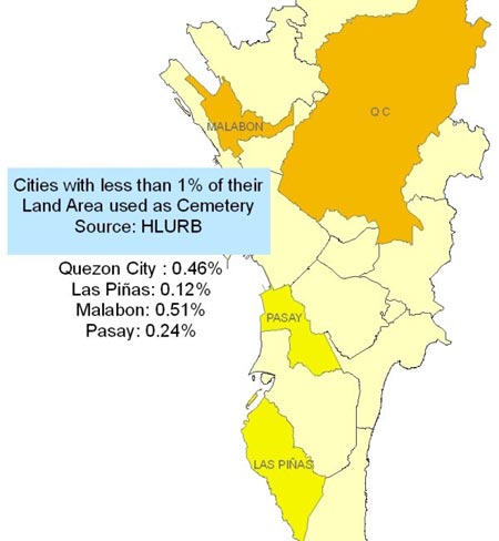Land is getting ever so scarce for the ever rising population of the dead. There is hardly enough, decent resting place for them in Metro Manila. Four cities â Las Piñas, Pasay, Quezon City, and Malabon â have allotted less than 1 percent of their total land area to cemeteries, according to a review of land use and population statistics by GMA News Research and GMANews.TV. Data from the Housing and Land Use Regulatory Board showed that only 0.12 percent or 4.59 hectares of Las Piñasâs 3,380-hectare land area has been allotted for cemeteries.
