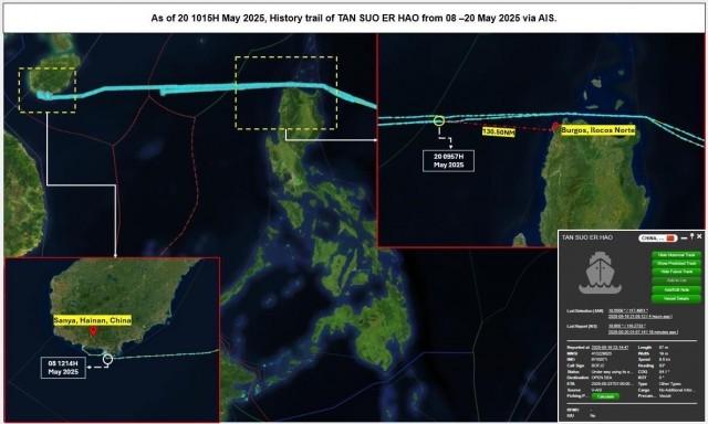 Tan Suo Er Hao departed Hainan on May 8 and was located 130.5 nautical miles from Burgos, Ilocos Norte, according to Tarriela.