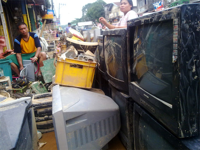 Resourceful residents attempt to turn garbage into cash, one of them trying to salvage electronic parts from soaked television sets and computer monitors.