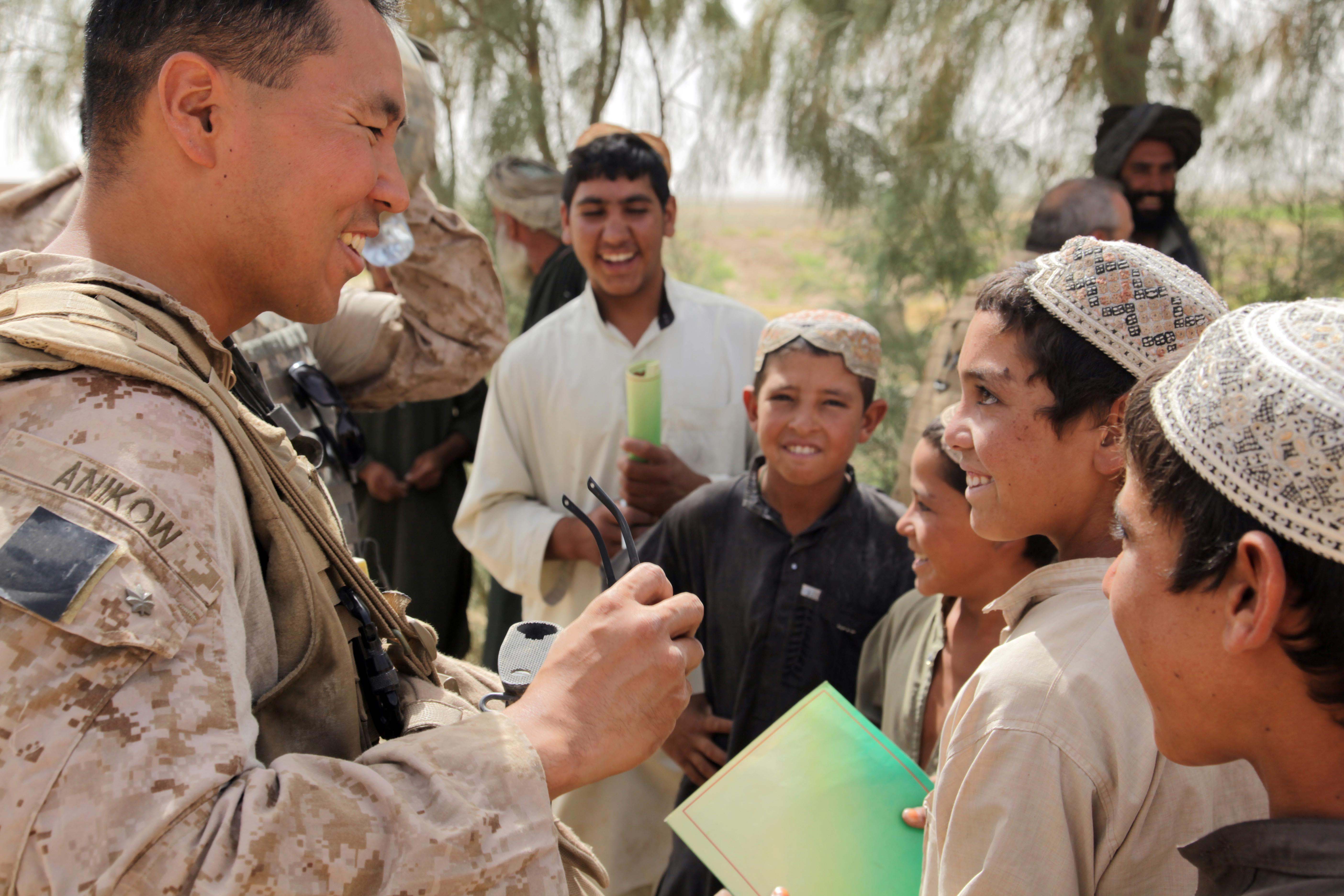 George Anikow, who was stabbed to death in Makati City last Saturday, was a Major in the US Marine Corps. He was the executive officer of a Civil Affairs detachment with Regimental Combat Team 3. He is seen here in a photo taken on Aug. 18, 2009 joking with local children during a patrol in Helmand province, Afghanistan. Photo by Sgt. Pete Thibodeau