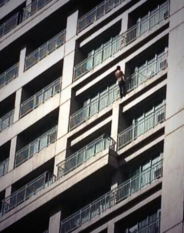 A photo posted by Juego on his Twitter account showed the man standing on the balcony and was preparing to jump. https://twitter.com/glenjuego/status/362739740228874240).