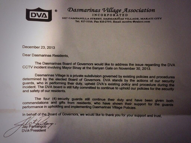 The letter, signed by Dasmariñas Village Association president Jay Pantangco, further said the security guards were rewarded for "upholding and implementing" the village's policies.