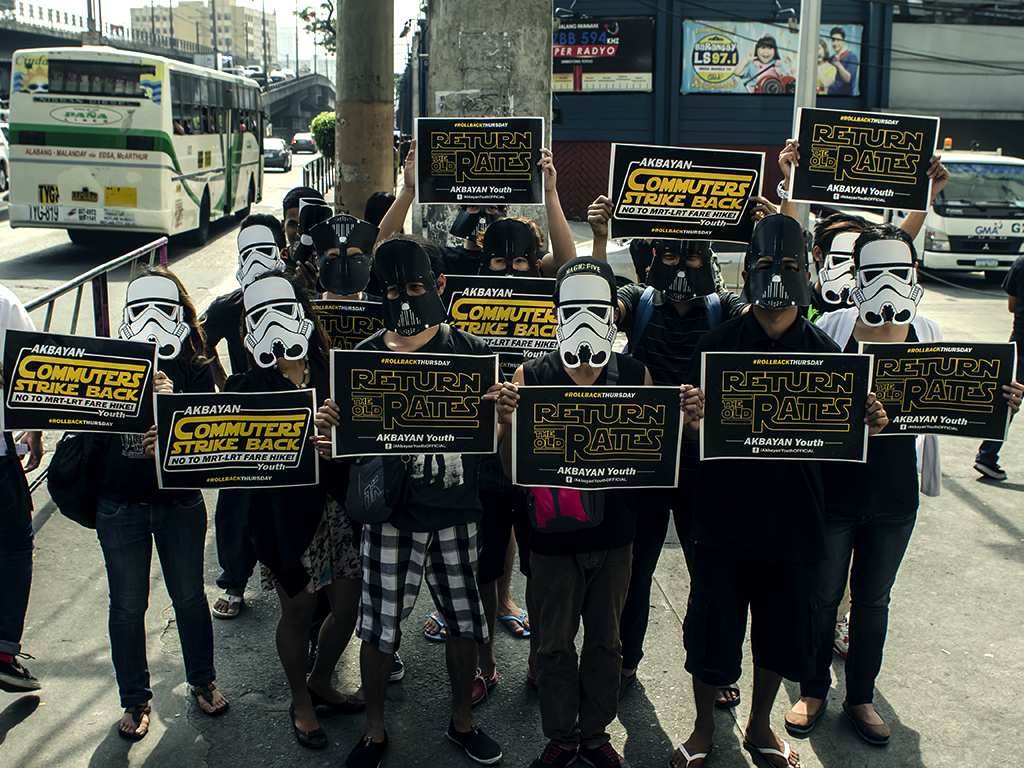 Waving posters that spelled out "Commuters Strike Back" and "Return of the Old Rates", Stormtroopers and Darth Vaders took over the GMA-Kamuning MRT station on Thursday morning.