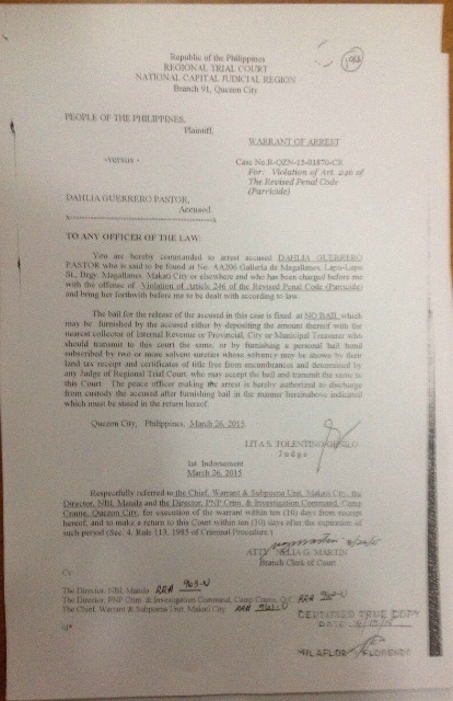 (Updated 8:11 a.m.) Quezon City Regional Trial Court-Branch 91 Judge Lita S. Tolentino-Genilo on Monday issued a warrant of arrest for Dalia Pastor over the killing of her husband, race car driver Enzo Pastor.