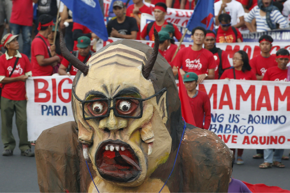 Protesters march with an effigy of President Benigno Aquino III towards Batasang Pambansa in Quezon City on Monday, July 27. Aquino will address the joint session of Congress, delivering his last State of the Nation speech this afternoon. Reuters/Erik de Castro