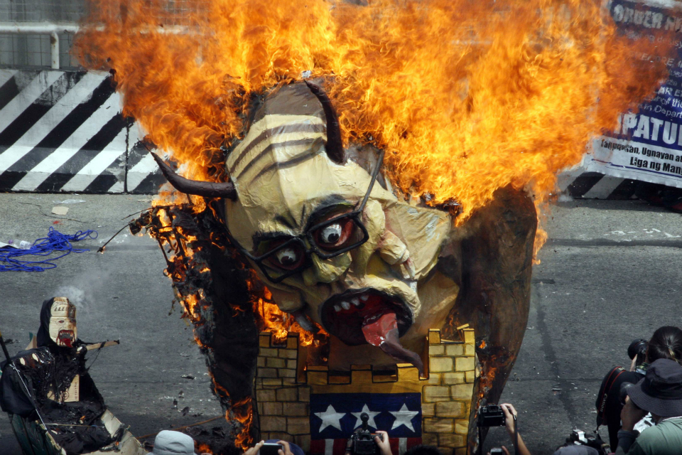 Five hours before President Benigno Aquino III could deliver his final State of the Nation Address at the Batasang Pambansa in Quezon City on Monday, members of militant groups burned a giant effigy of the President on Commonwelath Avenue.