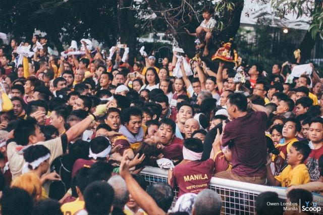 Isang dalaga ang nawalan ng malay at pinagtulungang buhatin ng mga deboto malapit sa Manila Hotel sa kalagitnaan ng Traslacion. Agad na inilapit ang babae sa mga medical volunteer sa lugar. Kuha ni Owen Lombos