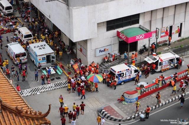 Ilang ambulansya at first aid responders ang nakapuwesto sa may Jones Bridge papuntang Binondo, Manila para tumulong sa mga deboto na kailangang agarang malapatan ng lunas. Kuha ni YouScooper Michiko Palaran.