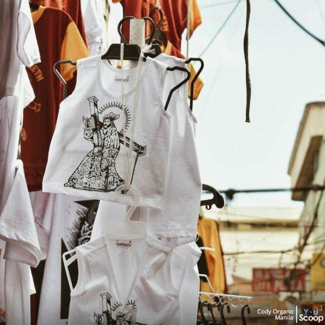 Sa labas naman ng simbahan ng Quiapo, nagkalat ang samu't saring souvenir na may kinalaman sa Pista ng Poong Nazareno katulad ng pambatang sando na ito na kinunan ni YouScooper Cody Organo.