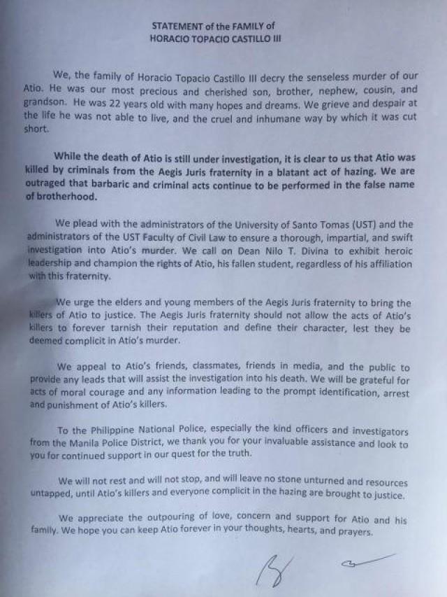 "We, the family of Horacio Topacio Castillo III decry the senseless murder of our Atio... we grieve and despair at the life he was not able to live, and the cruel and inhumane way by which it was cut short," it read.