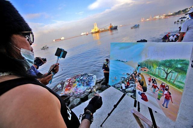 Meanwhile, an artist named Bebot Cultura was seen painting by the bay as part of his participation on International Coastal Cleanup Day.