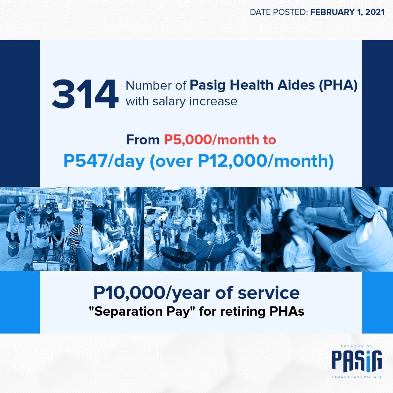 More than 300 Pasig Health Aides (PHA) will have their monthly salary increased from P5,000 to over P12,000 as part of efforts to strengthen primary health care in the city, Pasig Mayor Vico Sotto said Tuesday.