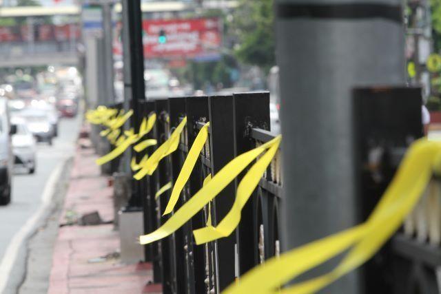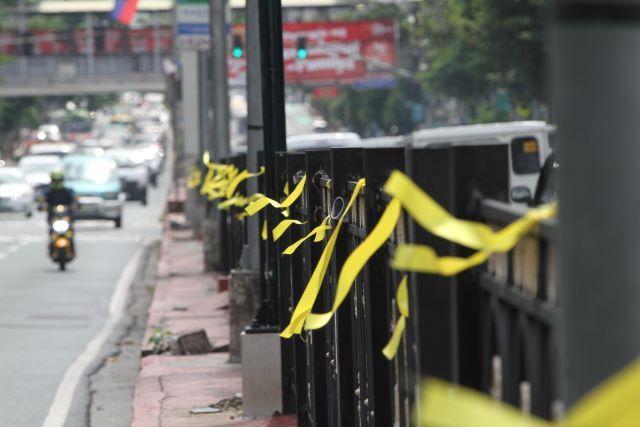 The yellow ribbons' appearance along the boulevard coincides with the public viewing of the former president's remains at the Church of the Gesu inside the Ateneo de Manila University's Quezon City campus.