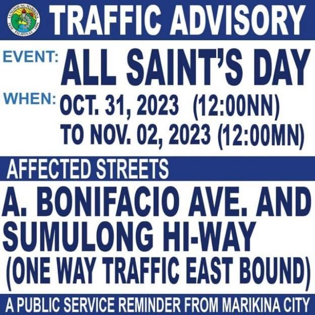 In a Facebook post, the local government unit said A. Bonifacio Avenue and Sumulong Highway will be one way from October 31, 12 noon, to November 2, 12 midnight.