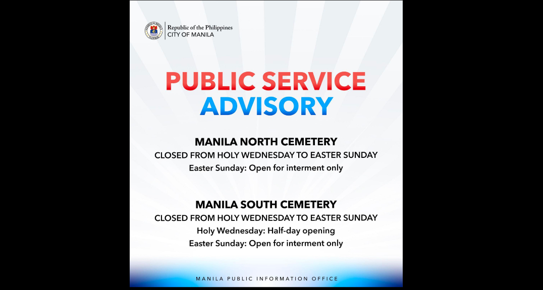 The North Cemetery in Sta, Cruz, Manila and South Cemetery in Makati will be closed to public starting from March 27, Holy Wednesday, to March 31, Easter Sunday, the Manila City government said.