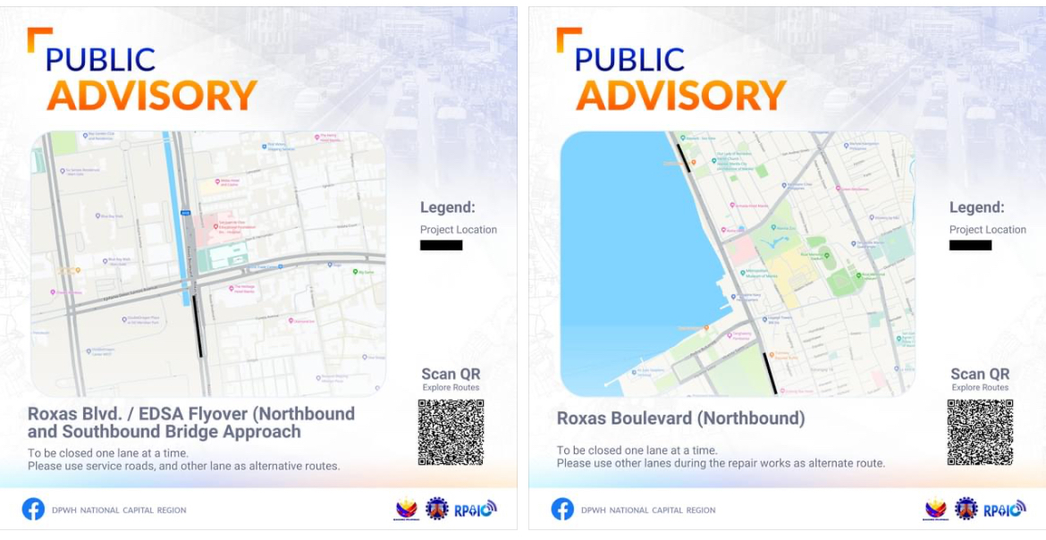 The DPWH South Manila District Engineering Office said starting April 5 to April 30, it will be conducting concreting, reblocking, asphalt overlay, and application of thermoplastic pavements along south and northbound bridge approach of Roxas Boulevard Flyover.