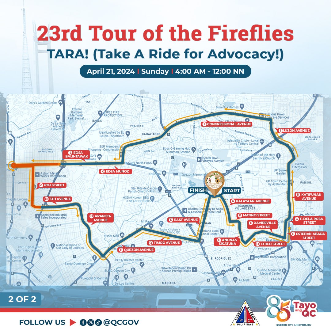 The LGU said the following areas may experience heavier than usual traffic from 4 a.m. to 12 p.m. on Sunday for the 23rd Tour of the Fireflies - TARA! (Take A Ride for Advocacy!) event of the Firefly Brigade: