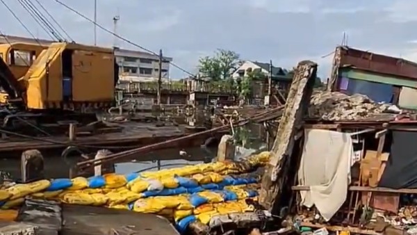 Sandbagging is being conducted to cover the breach caused by the collapsed wall, which is located inside a property owned by a shipyard. —Mariel Celine Serquiña/RF, GMA Integrated News