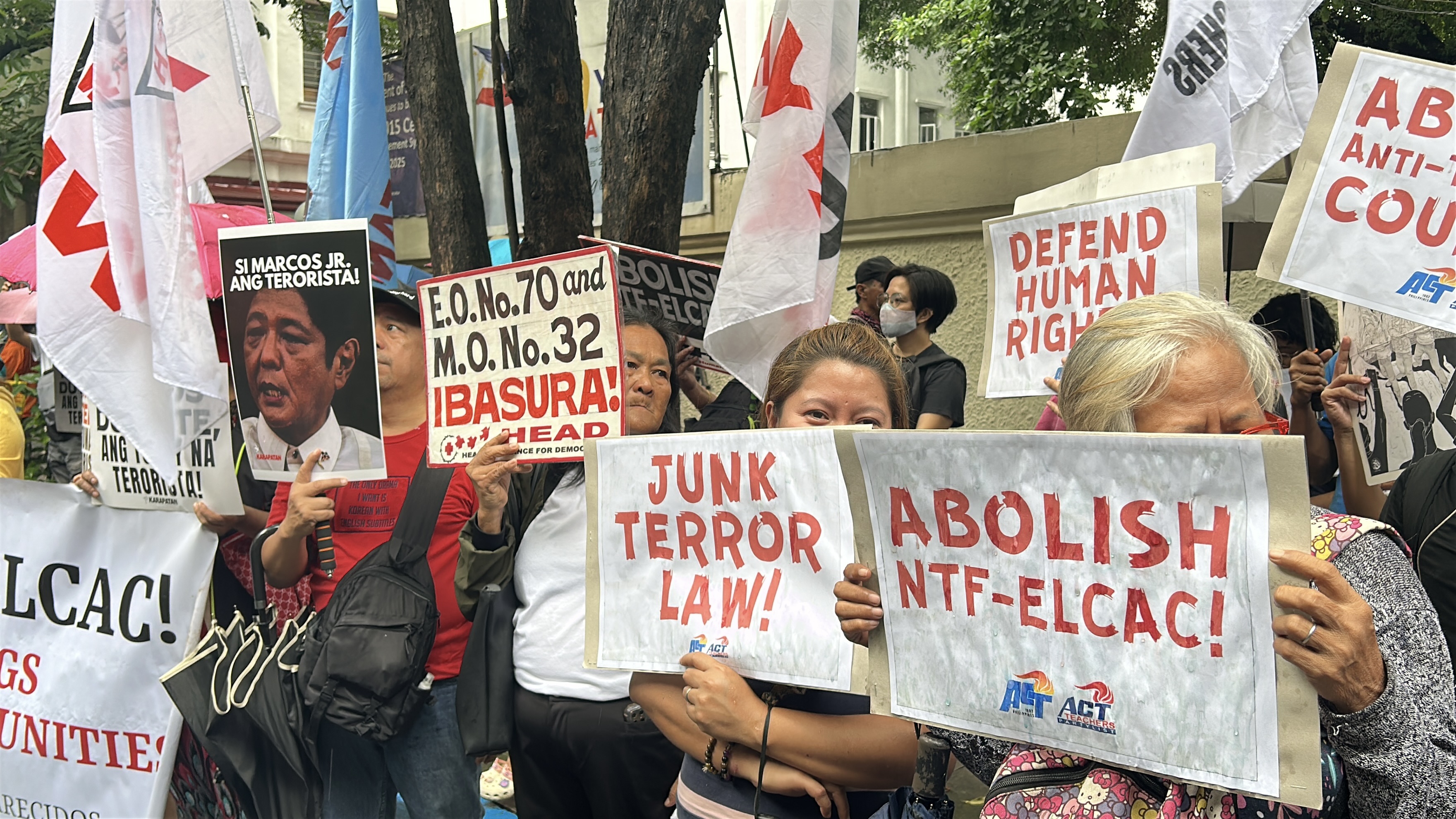 Despite the rainy weather, human rights activists on Thursday held a protest before the Department of Justice (DOJ) to reiterate their call to abolish the Anti-Terrorism Act (ATA) and the Terrorism Financing Prevention and Suppression Act (TFPSA).