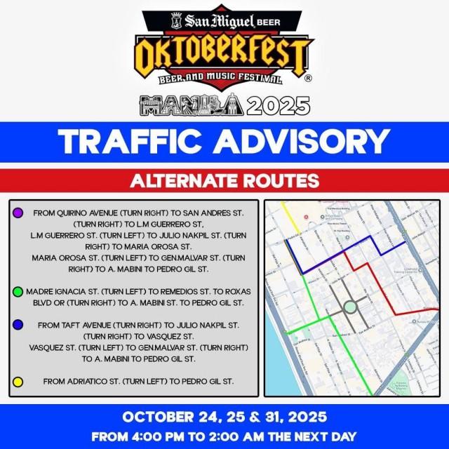 The City of Manila announced Thursday temporary road closures in parts of Malate to give way to the Manila Oktoberfest 2025 Beer and Music Festival, which will be held at Remedios Circle on October 24, 25, and 31.