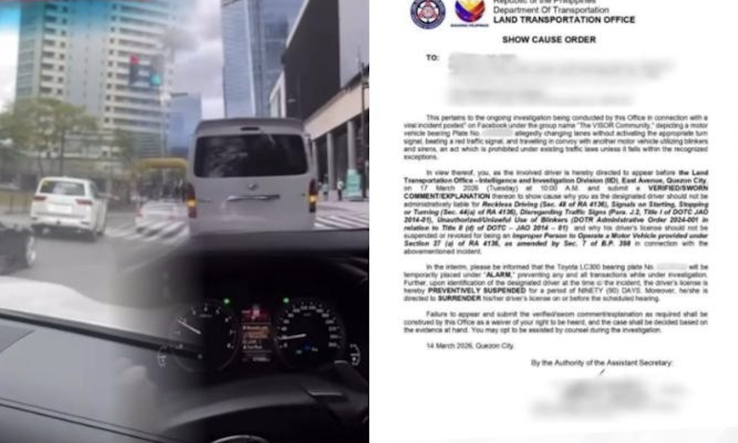 The LTO said it immediately issued SCOs against the involved drivers and registered owners, directing them to explain why they should not face charges for reckless driving, improper use of signals when starting, stopping or turning, disregarding traffic signs, unauthorized use of blinkers, and allowing an improper person to operate a motor vehicle.