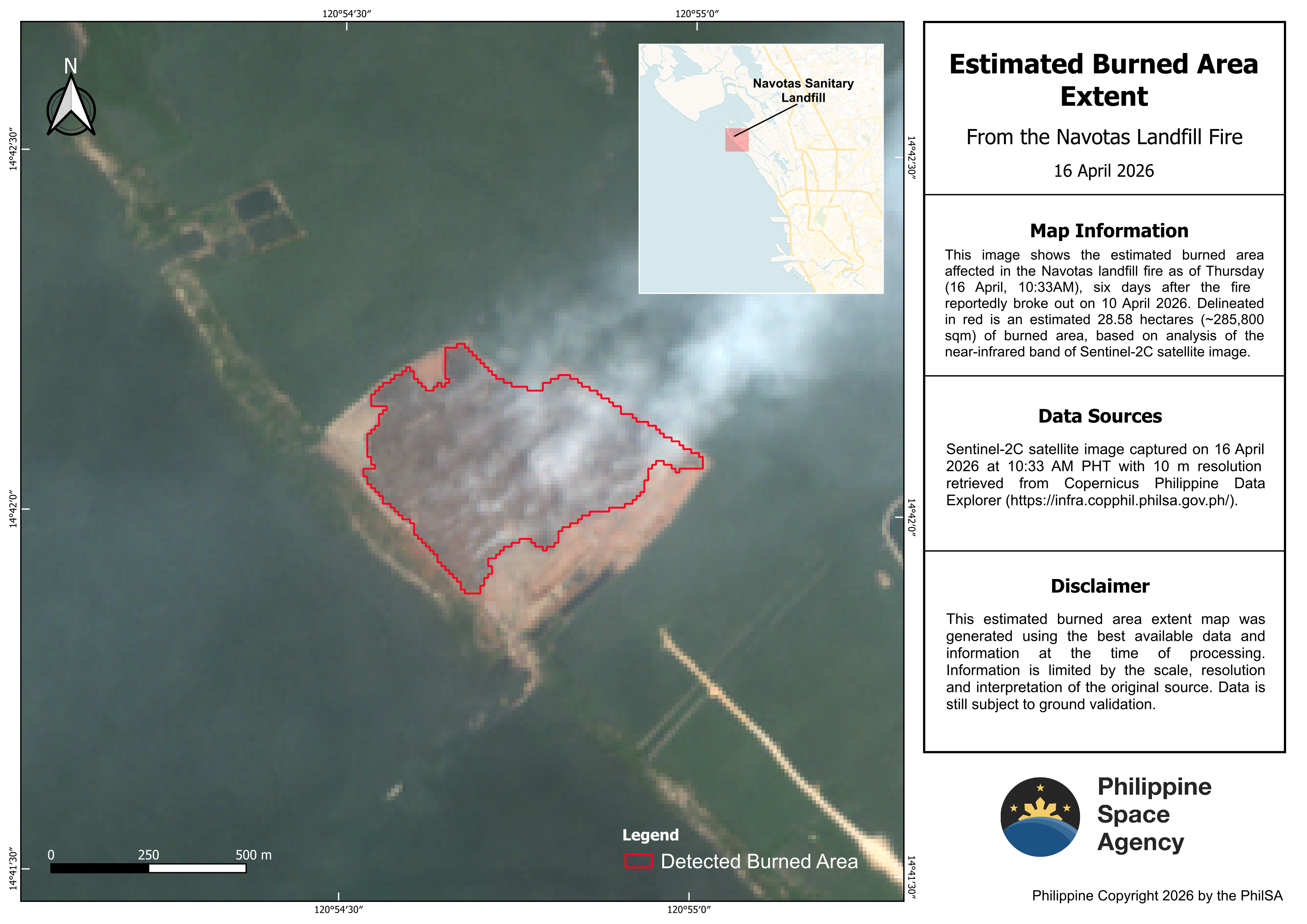 The fire at the Navotas Sanitary Landfill has burned at least 28.6 hectares as of last Thursday, according to the Philippine Space Agency (PhilSA).