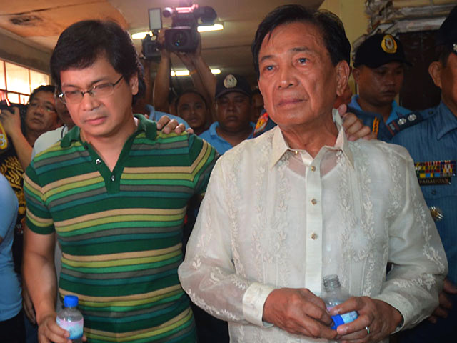 Ex-Comelec chief Benjamin Abalos (right) attends his poll sabotage hearing in Pasay with son Mandaluyong Mayor Benhur.