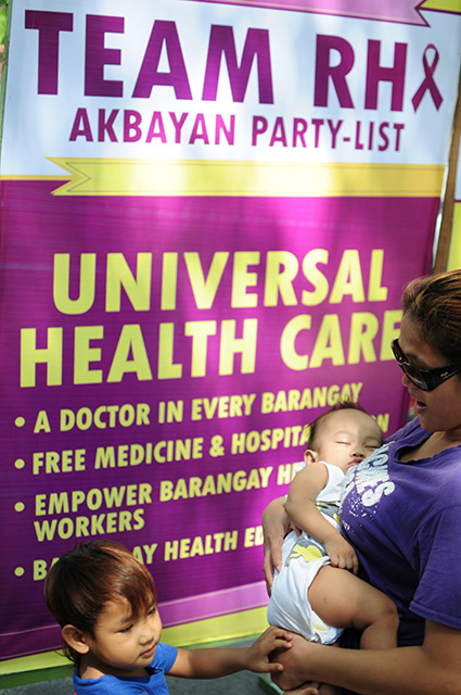 "Team Buhay/Team Patay" posters plastered on the wall of San Sebastian Cathedral in Bacolod City. Akbayan's posters, mounted in Manila, are stamped with "Team RH" across the top. The yellow tarps call on voters to choose senatorial candidates who will defend the RH Law. The purple tarps campaign for universal healthcare, which the group characterizes as having a doctor in every hospital, access to free medicine and hospitalization for all, training and skill-building for barangay health workers, and barangay health education.