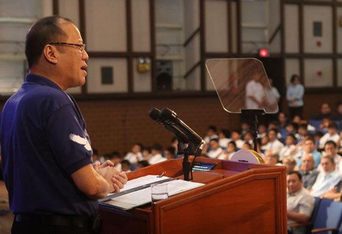 PNoy addresses audience at Ateneo de Manila on Saturday. Ateneo president Jett Villarin, SJ listens on stage. Malacañang Photo Bureau