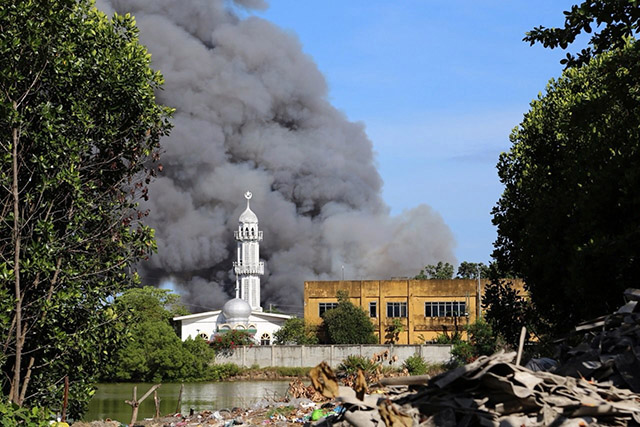 Fire destroys houses in a community near a mosque in Zamboanga City on Friday, September 13, as fighting between government forces and MNLF gunmen rages on its fifth day. Chino Gaston
