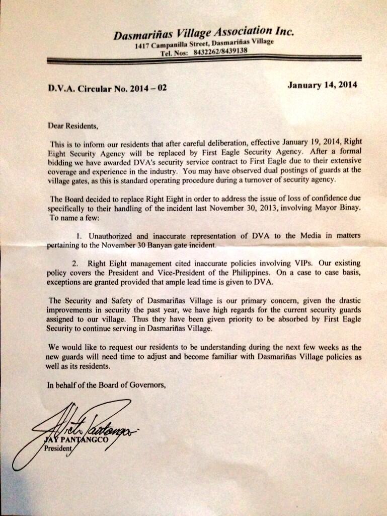 In a January 14 circular, the Dasmariñas Village Association informed its residents that the “Right Eight Security Agency will be replaced by First Eagle Security Agency... to address the issue of loss of confidence” and that the transition to the new agency has been underway.