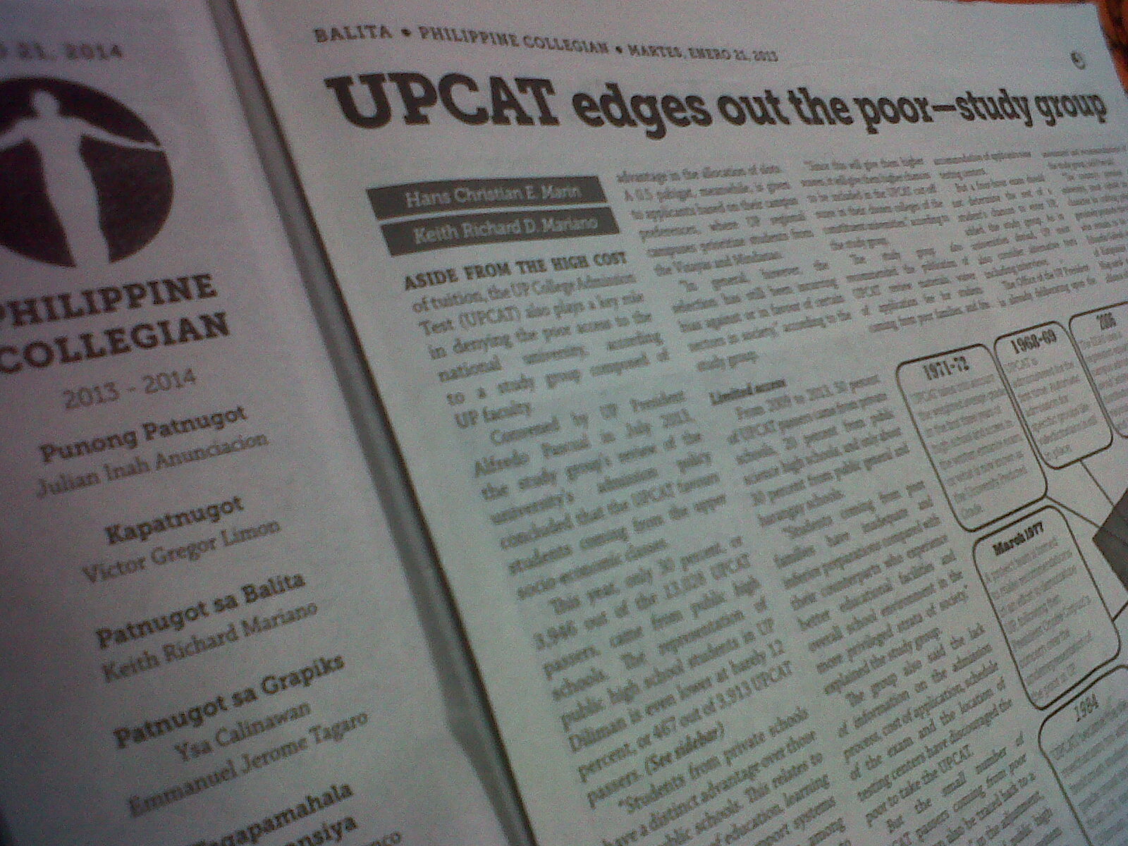 The Philippine Collegian reports on revisions proposed to the University of the Philippines College Admission Test after a study group found that the exam edges out the poor as only about 30 percent of UPCAT passers come from the country's public general high schools and barangay schools. Earl Victor L. Rosero