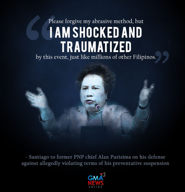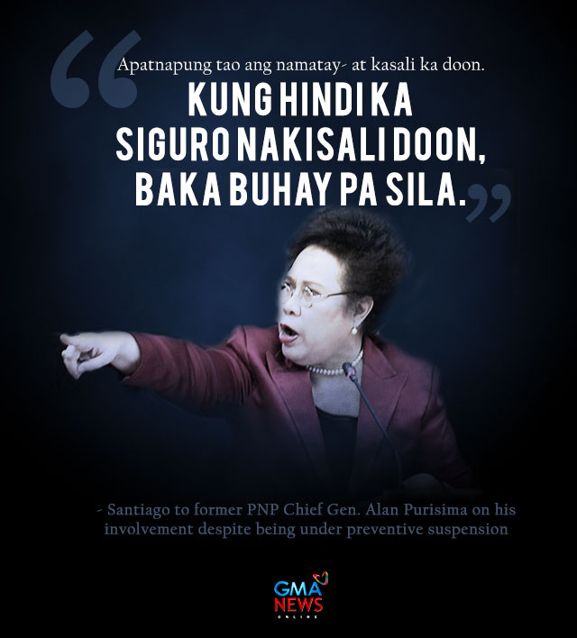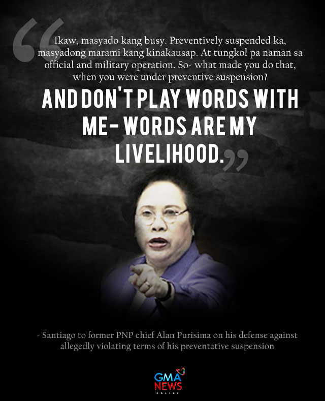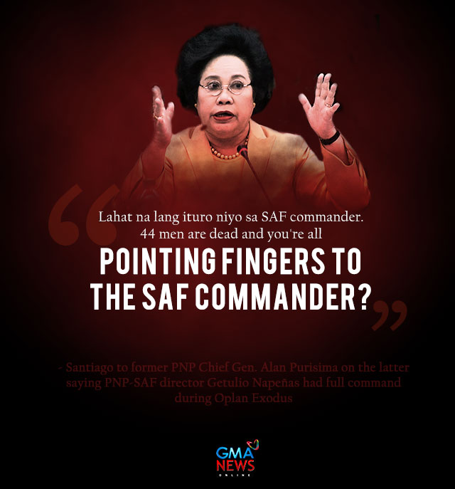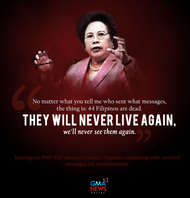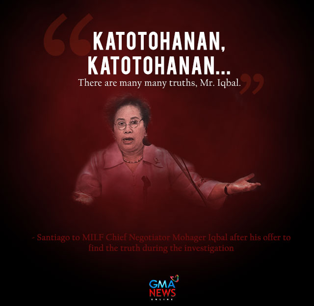 Here are some of Santiago's quotes, compiled by GMA News Online, from Thursday's hearing on the operation that may have netted suspected notorious terrorist Marwan but also led to the deaths of 44 police commandos in the hands of rebels with whom the government has an existing peace agreement.