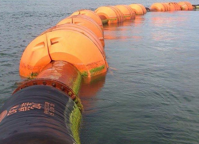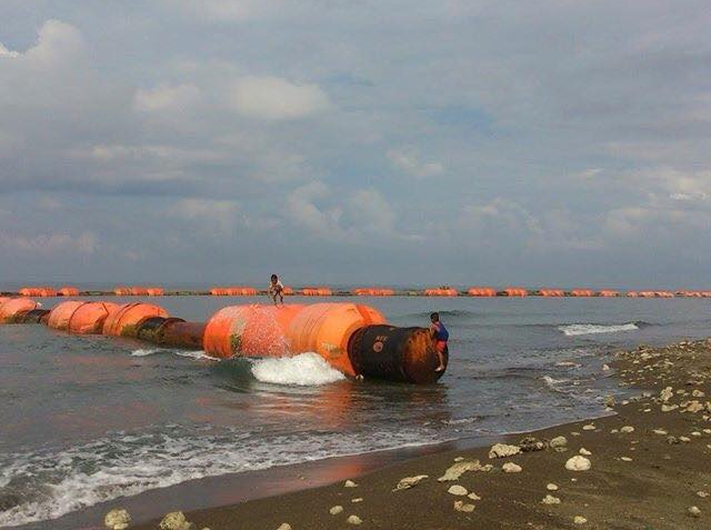 Markings on one of the booms indicated a phone number that possibly corresponds to a Chinese firm making rubber products such as dredging hoses, oil hoses, quakeproof rubber support, rubber fenders and other rubber products. — Joel Locsin/LBG, GMA News