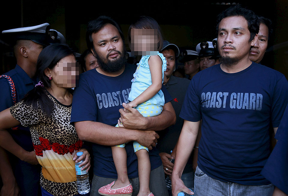 Rodlyn Pagaling (2nd left) and Gringo Villaruz (right), the Coast Guard personnel taken hostage by Abu Sayyaf bandits. --Rueters/Romeo Ranoco