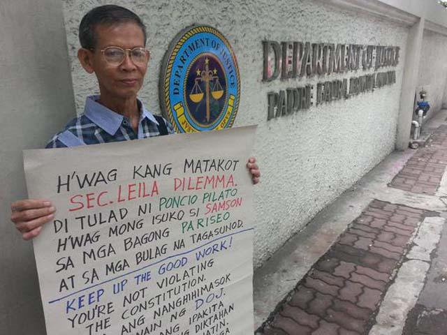 In his placard, Kwe wrote: "H'wag kang matakot Sec. Leila Dilemma. Di tulad ni Poncio Pilato, h'wag mong isuko si Samson sa mga bagong Pariseo at sa mga bulag na tagasunod."
