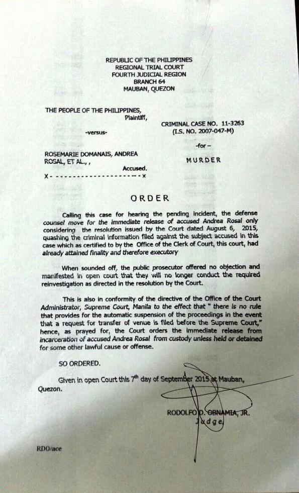 — Edre Olalia (@EdreOlalia) September 7, 2015Olalia earlier reported that the daughter of the former spokesperson of the NPA was cleared of charges of murder by a Quezon court.