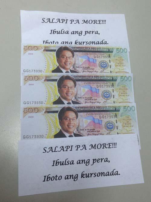 Bearing Roxas’ face, the fake bills were placed in white envelopes with the inscriptions in front “Salapi pa more!!! and at the back "Ibulsa ang pera, iboto ang kursonada.”